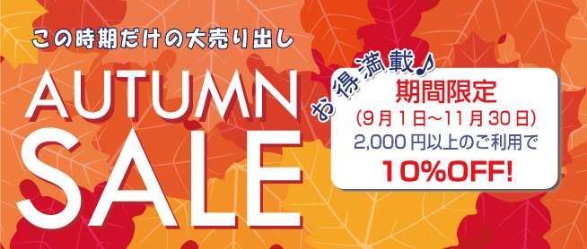 2024年9月1日〜2024年11月30日までの期間に限り、2,000円以上のご注文で一律10%OFF割引します。この機会 にぜひご利用下さい。